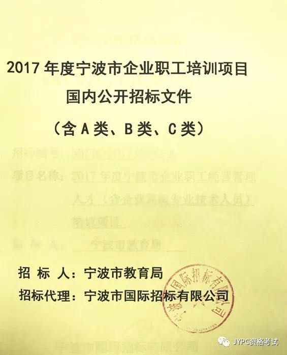 根据《中华人民共和国政府采购法》及有关办法,宁波市国际招标有限公司,就宁波市教育局关于承办2017年度宁波市企业职工高技能人才(含企业中级专业技术人员)培训项目进行了公开招标。在招标文件中,JYPC被纳入为发证单位。中标的培训单位,享受政府财政补贴。
