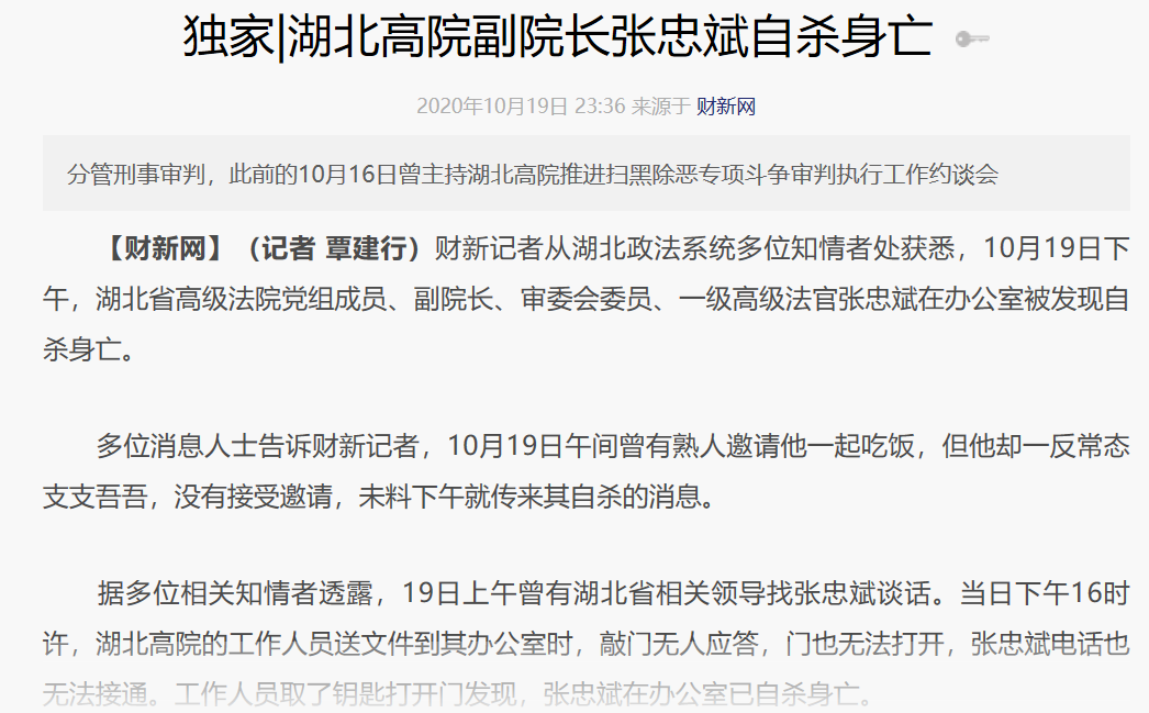 10月19日下午,湖北省高级人民法院党组成员、副院长、审判委员会委员,一级高级法官张忠斌在办公室内自杀身亡。