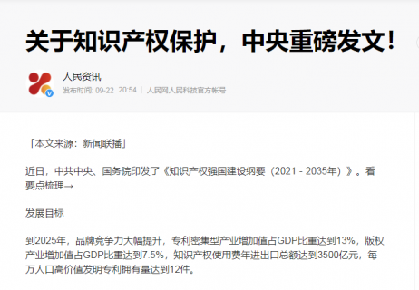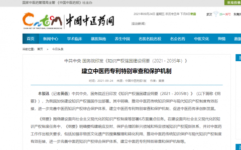 中共中央、国务院近日印发《知识产权强国建设纲要(2021-2035年)》(以下简称《纲要》),为我国加快建设知识产权强国作出部署。其中明确,推动中医药传统知识保护与现代知识产权制度有效衔接,进一步完善中医药知识产权综合保护体系,建立中医药专利特别审查和保护机制,促进中医药传承创新发展。