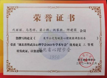 在本次年会备受瞩目的学术论文评奖环节,由我院代丽丽、马恩祥、梁小群、祝家胜、师建国等人的论文《某市公交驾驶员心理关爱意向调查》从众多参赛论文中脱颖而出,被评选为湖北省暨武汉市心理学会2021年学术年会“优秀论文三等奖”,并得到在大会第二分会场——心理健康分论坛进行专项汇报的机会。