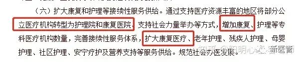 大家可以观看《意见》的第二大章第6节:扩大康复和护理等接续性服务供给。通过支持医疗资源丰富的地区将部分公立医疗机构转型为护理院和康复医院、支持社会力量举办等方式,增加康复、护理等专科医疗机构数量,完善接续性服务体系,扩大康复医疗、老年护理、残疾人护理、母婴护理、社区护理、安宁疗护及营养支持等服务供给。规范社会办医发展。