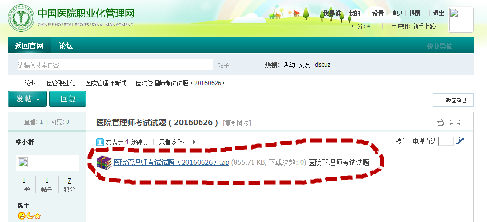 3. 打开帖子“医院管理师考试试题(20160626)”下载附件至个人电脑。