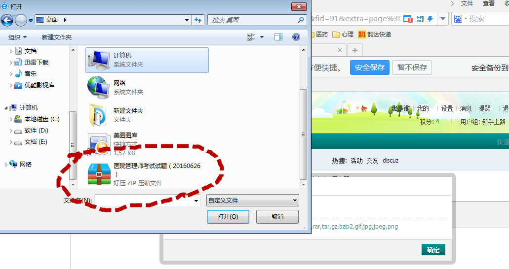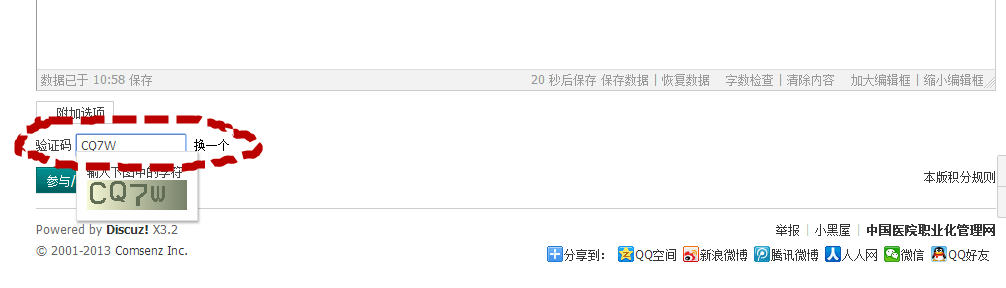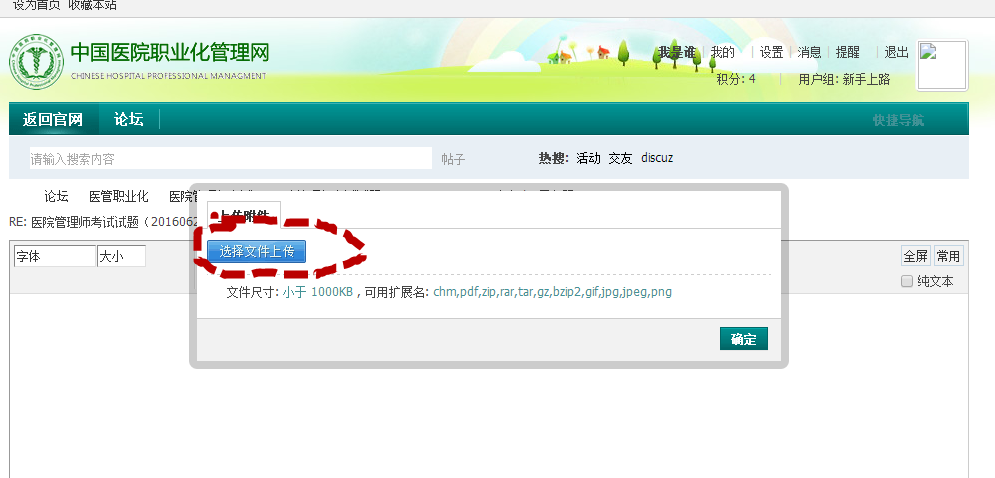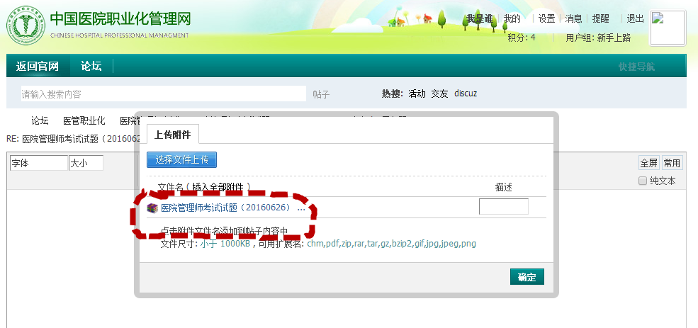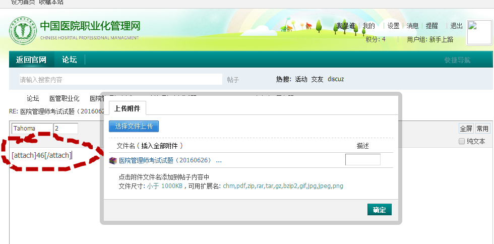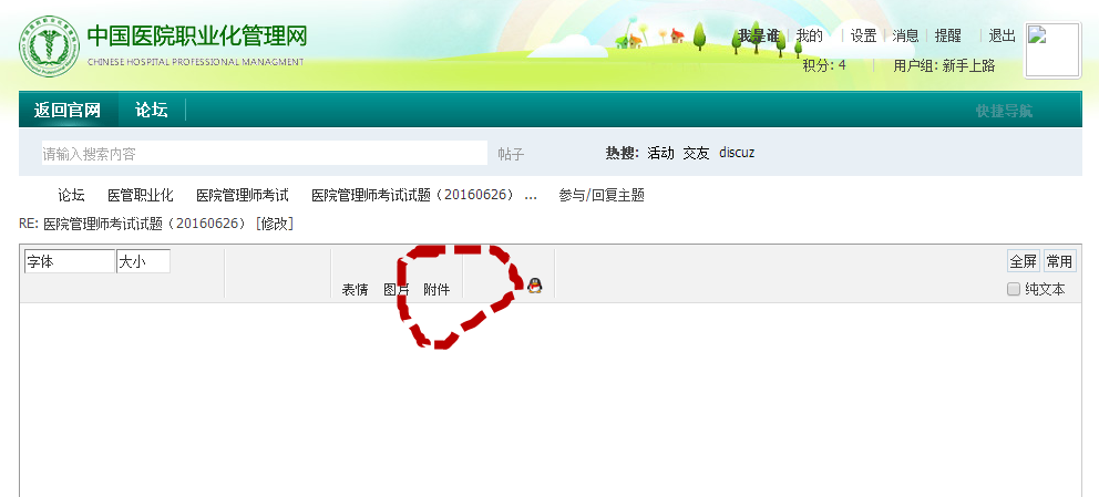 5. 提交答题卷:回复帖子“医院管理师考试试题(20160626)” →“高级模式”→“高级”→“附件”→“选择文件上传”→“ 点击附件文件名添加到帖子内容中”→正文中输入“***(考生姓名)答题卷” →“验证码”输入(注意大小写)→“参与/回复主题”。