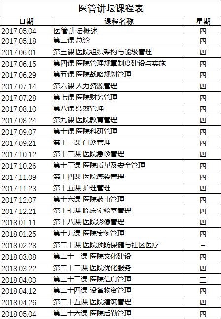 医院管理职业化讲坛,简称【医管讲坛】,其设立目的,是通过相关医院管理案例引导、互动交流,深度解读《中国医院协会医院管理指南》(2016版)一书,普及医院管理系统知识,帮助医院中下层管理人员系统掌握医院管理的基本标准与规范,从而促进医院职业化管理的形成。