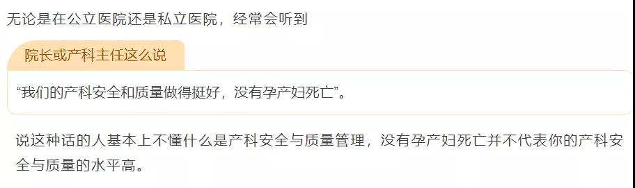 我国的医院实行的是分级管理,基层医院的产科,是生理产科,无产妇死亡应该是绝对的要求。而城市大医院做的是病理产科,产妇的风险大,对于产科的管理质量要求最高,这样才能避免产妇的死亡风险。不论是基层小医院还是城市大医院,都应把避免产妇死亡做为基础的安全质量。当然,最高层级的医院没有办法再往上转诊,只能独自承担产妇死亡风险,但同样需要有追求产妇无死亡的质量管理。