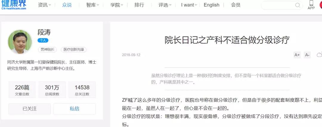 另外,文中说分级诊疗不等于分段诊疗,这恰恰是作者不理解职业化管理的系统化,互联网医疗就是把医院做到了互联网智慧医院,在互联网思维和医联体双向下,基层医院就如同城市大医院的科室或分院,基层医院的产科与城市大医院的产科就可以通过分段医疗来使医疗资源合理配置,使病人的医疗成本做到最小化。分级医疗要做责任分工与分级,拿产科来说,基层医院做生理产科,城市大医疗做病理产科,产前保健在基层,产科疑难诊断在城市大医院。同时利用妇产保健的三级网络进行产妇从产前检查到分娩的分段医疗保健正是我们国家几十年来的成功经验。产妇从怀孕的周期长,产妇不是病人,产科凭什么不能做分级诊疗,从职业化管理的角度。从著名大医院的院长文中谈出产科不能做分级诊疗这个观点,不可能是管理无知,更有可能是医院集团利益驱使,因为在目前的环境下,大医院的运营更加困难。
