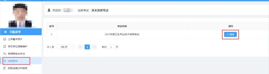 3、先点击左侧导航菜单中的“成绩查询”功能,再点击2023年度卫生专业技术资格考试项目右侧的“查询”按钮即可显示查询结果。